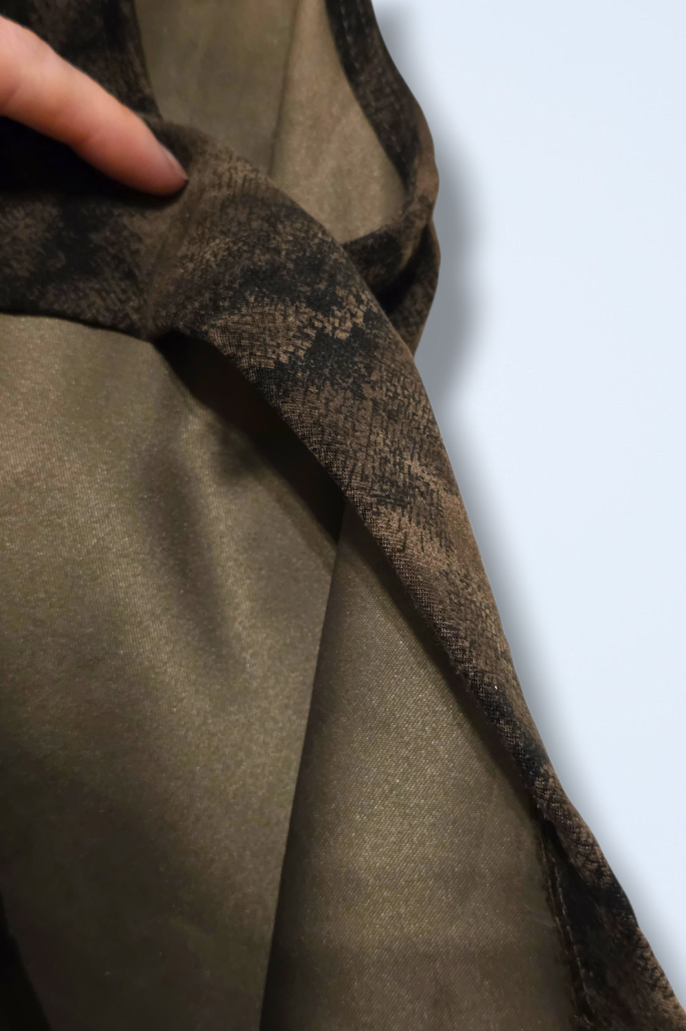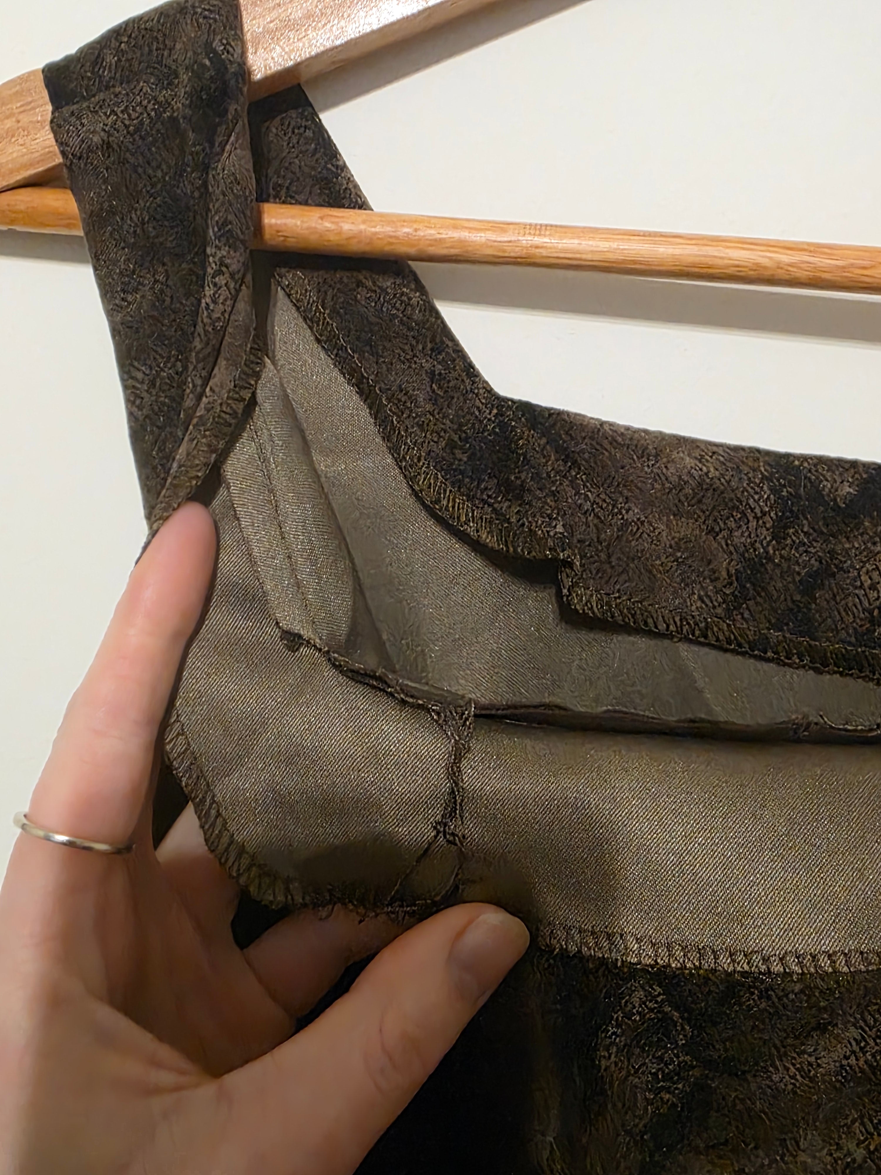 Elegant vintage Fairweather sheath dress in a deep olive brown tone with a subtle textured pattern. Features a flattering square... Read more