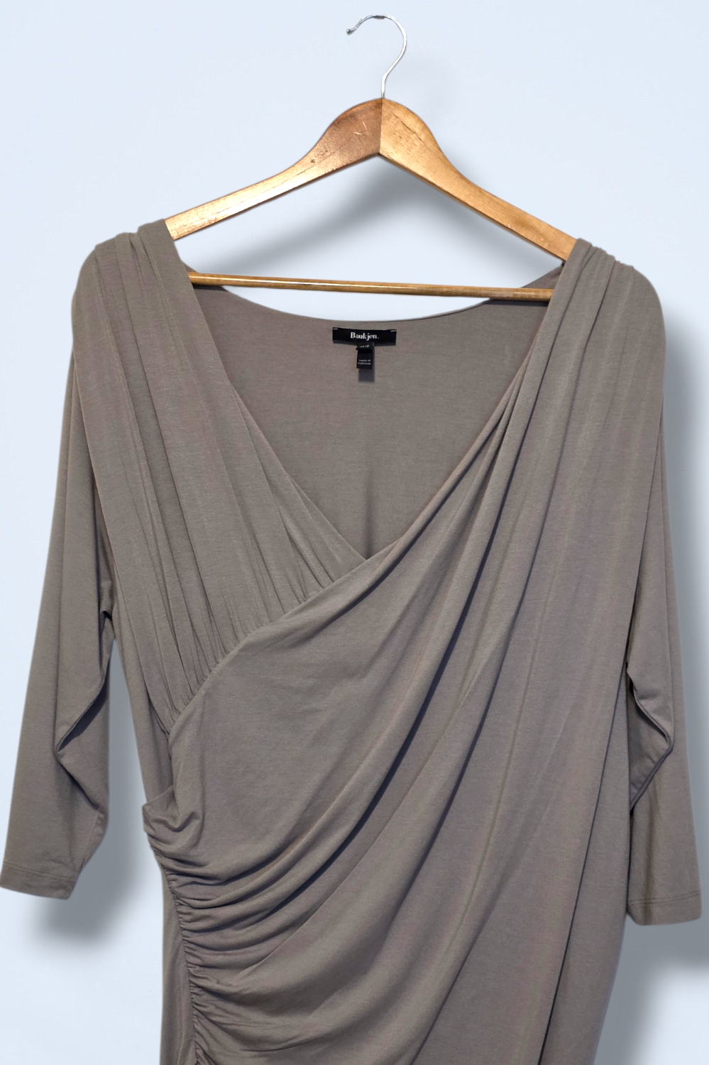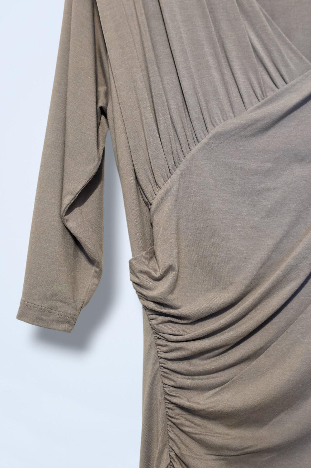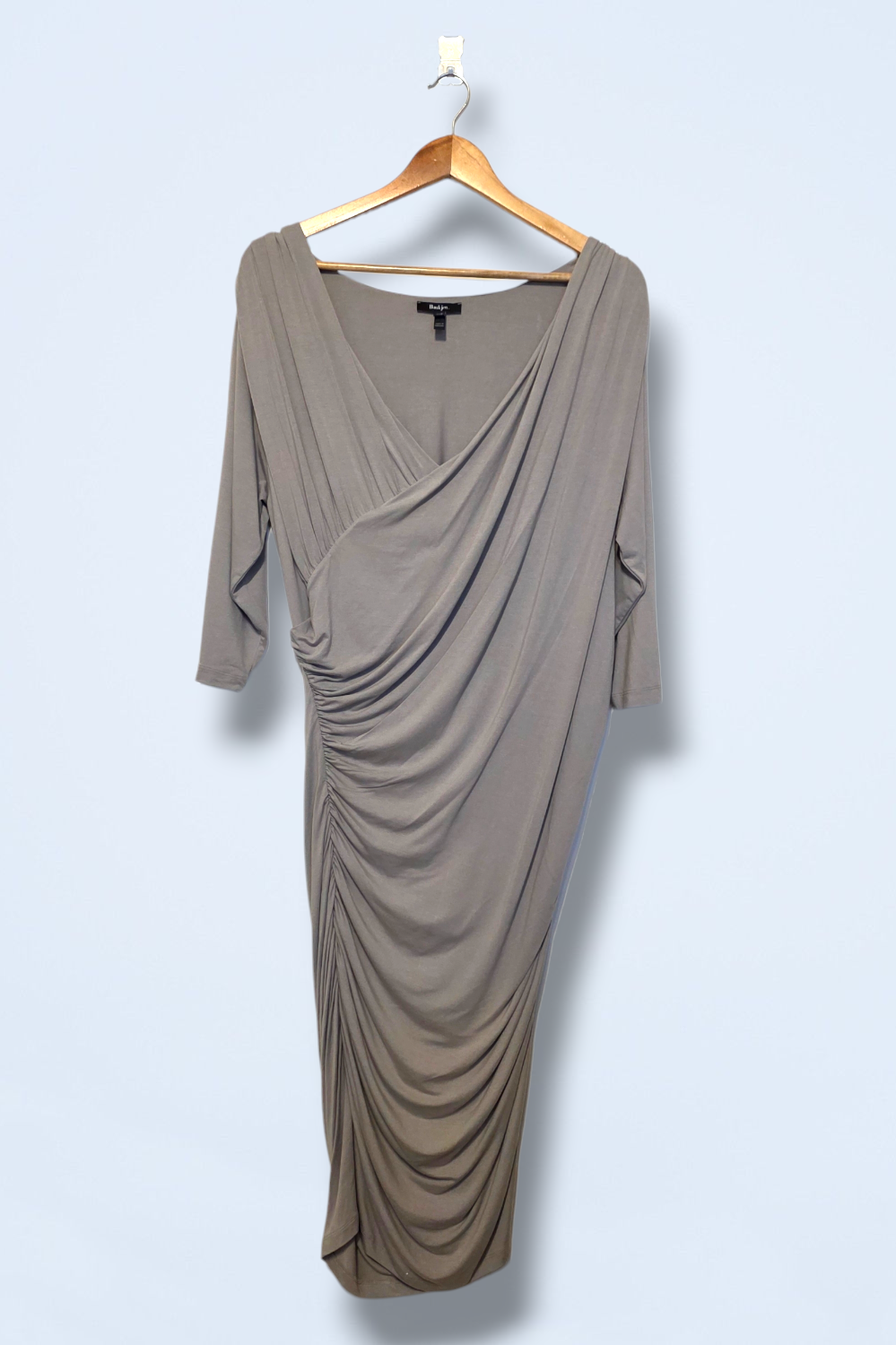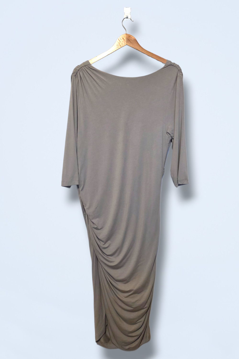 Baukjen – UK 18 – Shirred Midi Dress in Taupe ¾ Sleeves