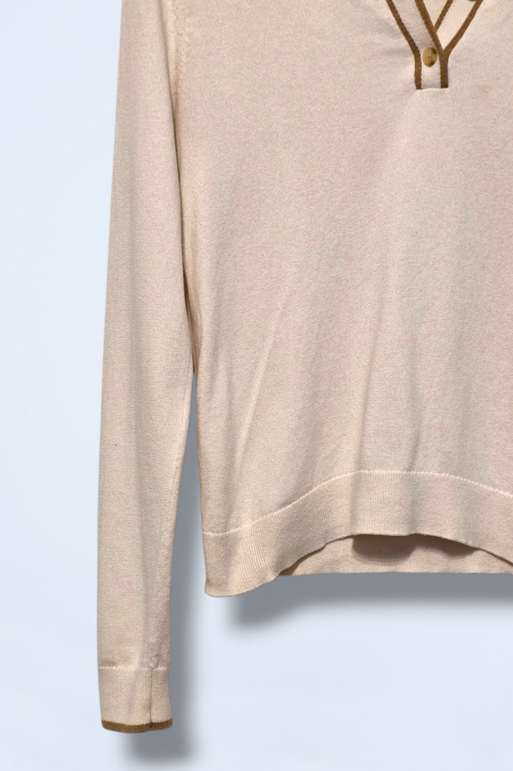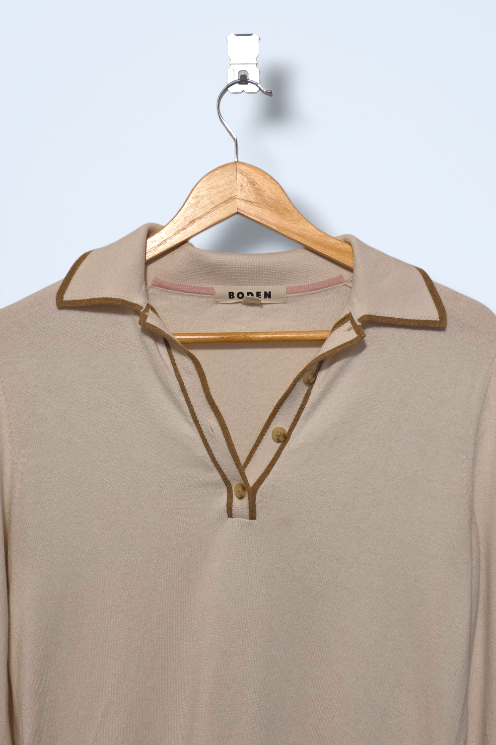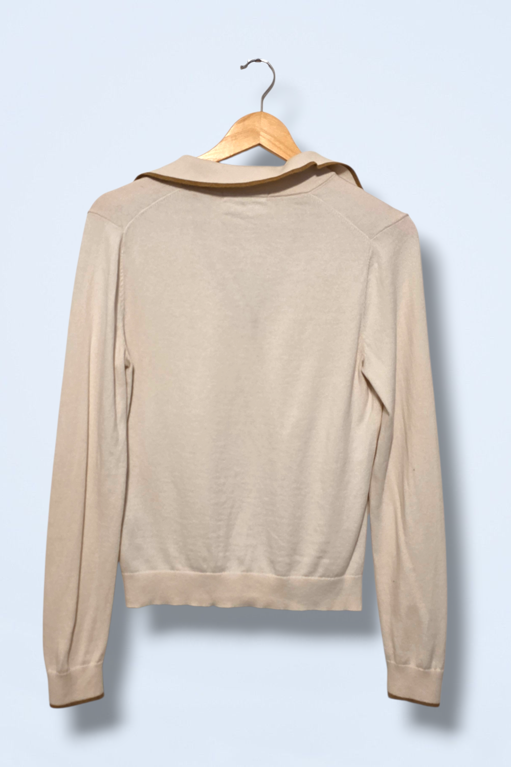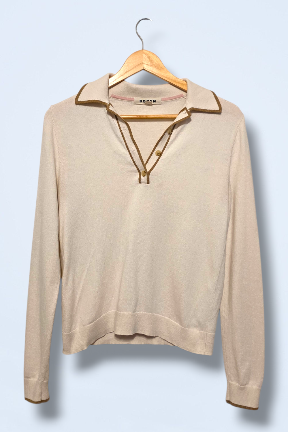 Button neck, long-sleeved cream top with a gold/bronze detail. Brand: Boden Size: Small Condition: Great, pre-owned condition Material: Cotton & wool P2P:... Read more