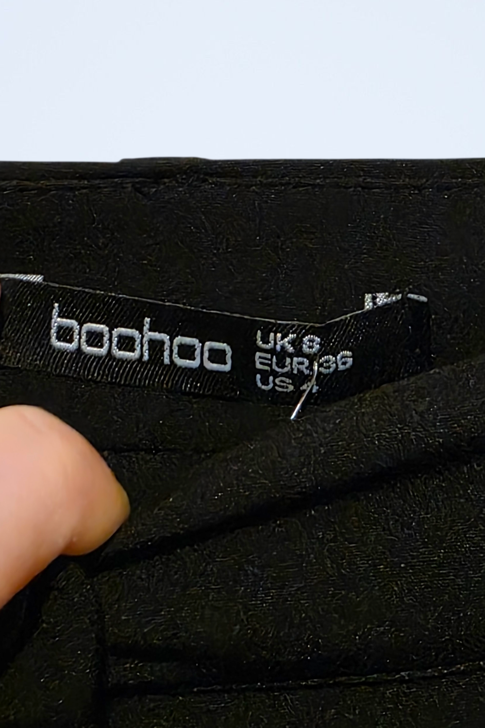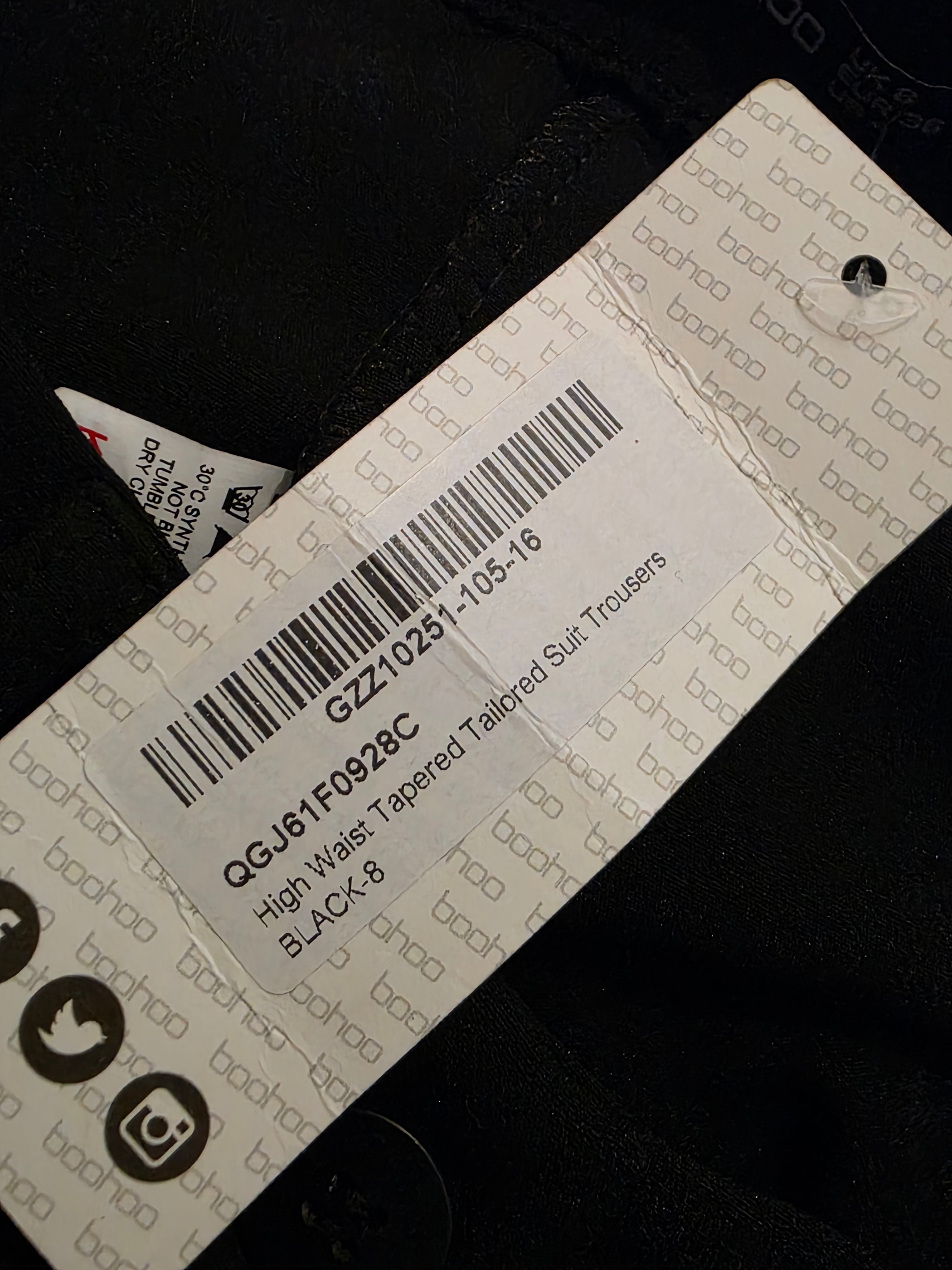 Black tapered suit trousers, button and zip fastening. Brand: BooHoo Size: UK 8 Condition: New, with tags Material: Polyester... Read more