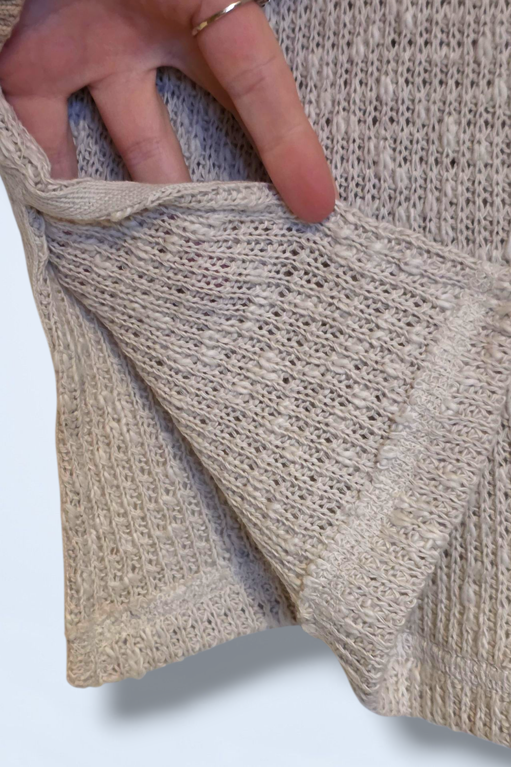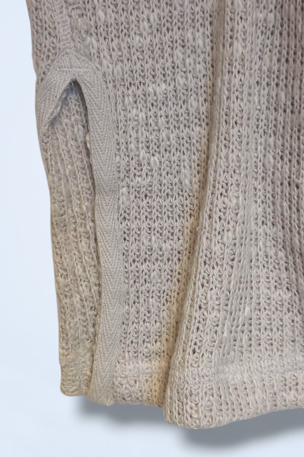 Neutral v-neck strappy cami, knitted with a short slitted side