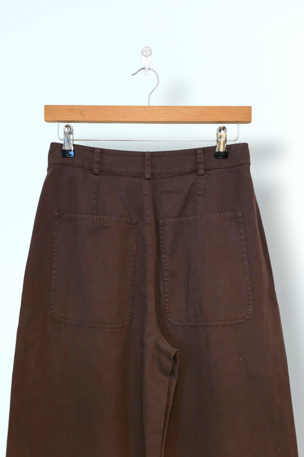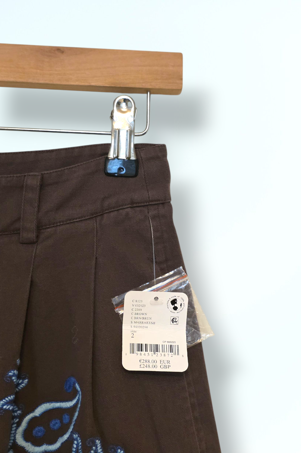Brown wide leg trousers with a blue embroidered floral paisley print.