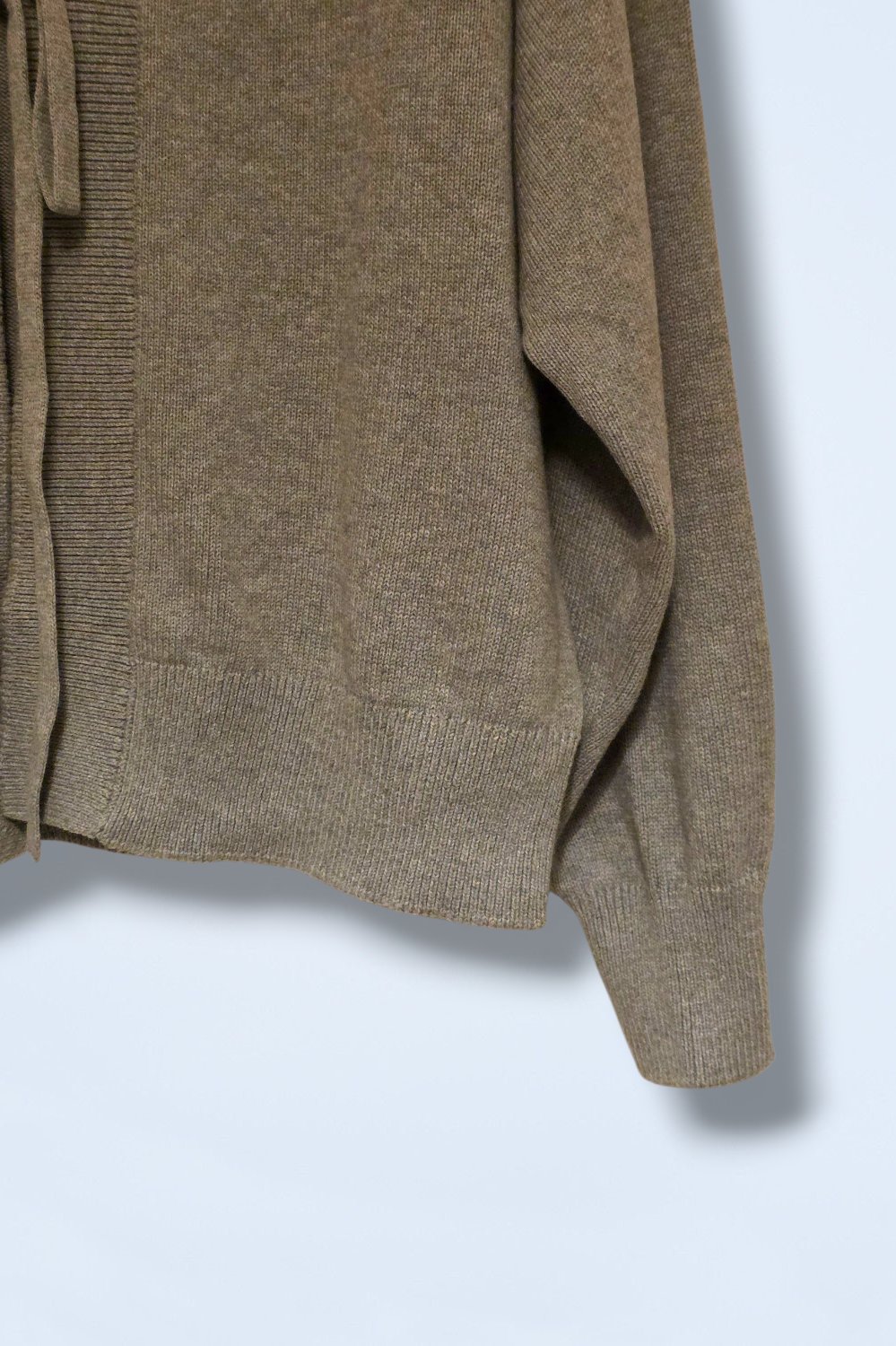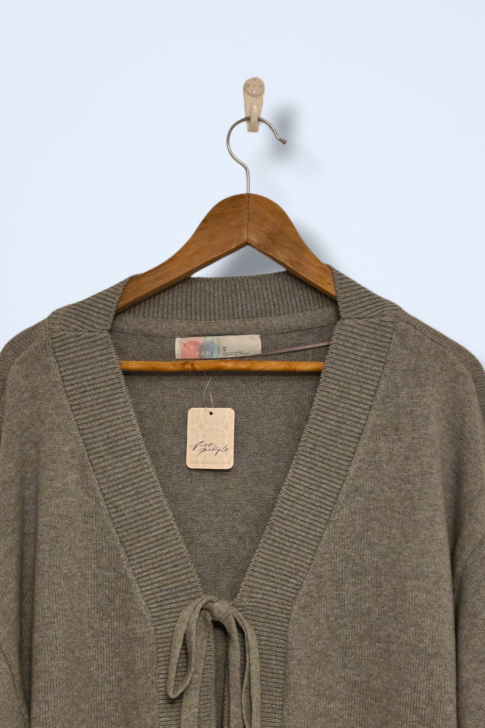 Grey oversized, relaxed fit two piece lounge set. Includes long-sleeved tie cardigan style top, and straight leg trousers – knitted