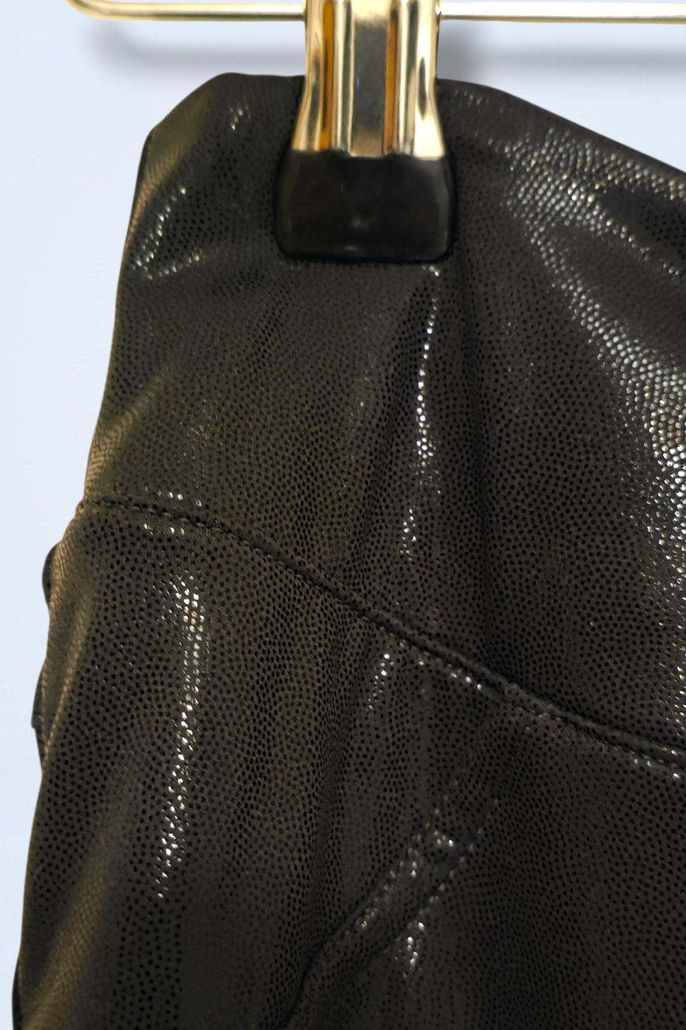 Black shiny high waist leggings with bum pockets, and faux side pockets.