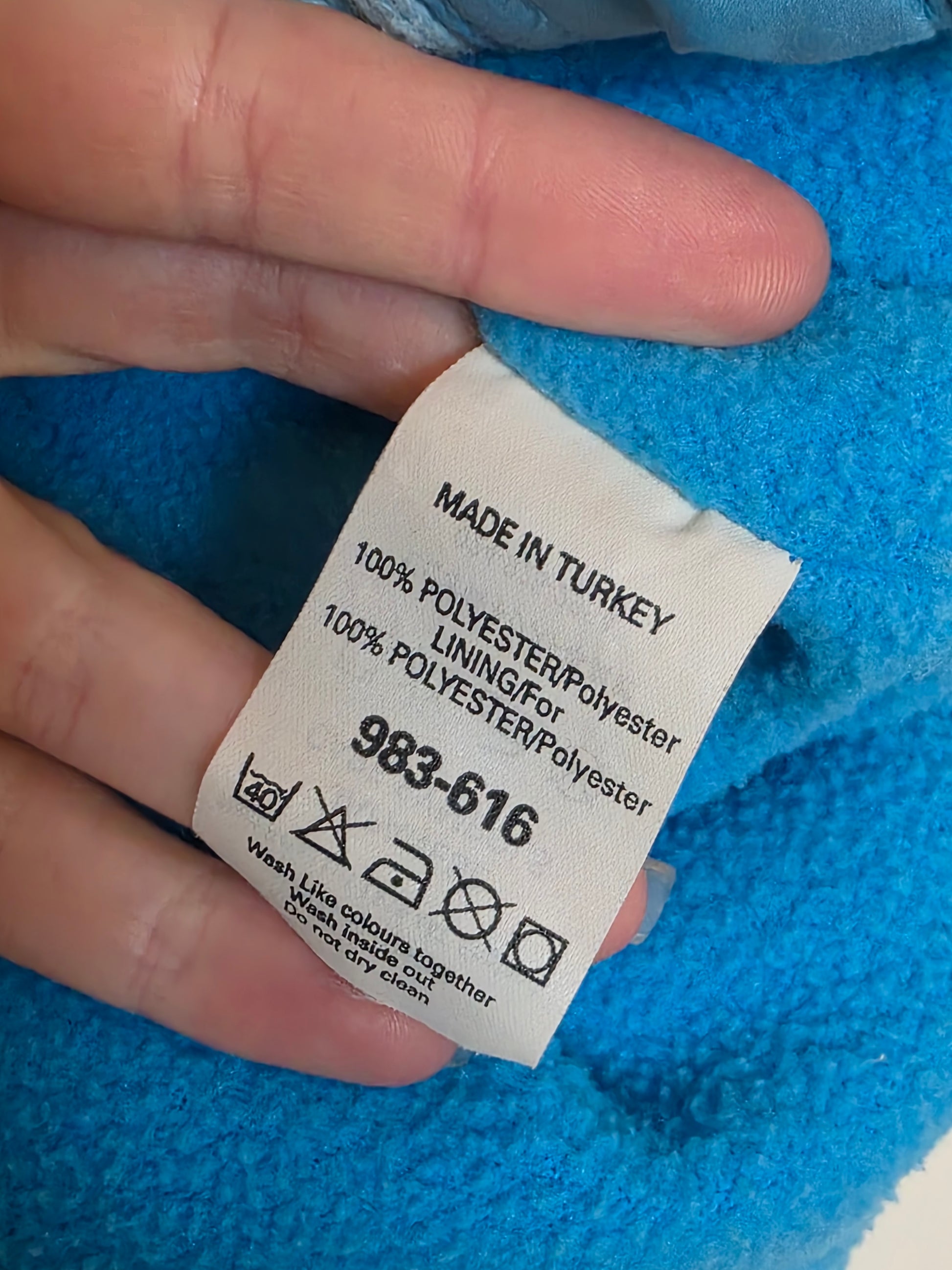 Bright blue zip and snap button fastening gilet with fleece inner and pockets.
