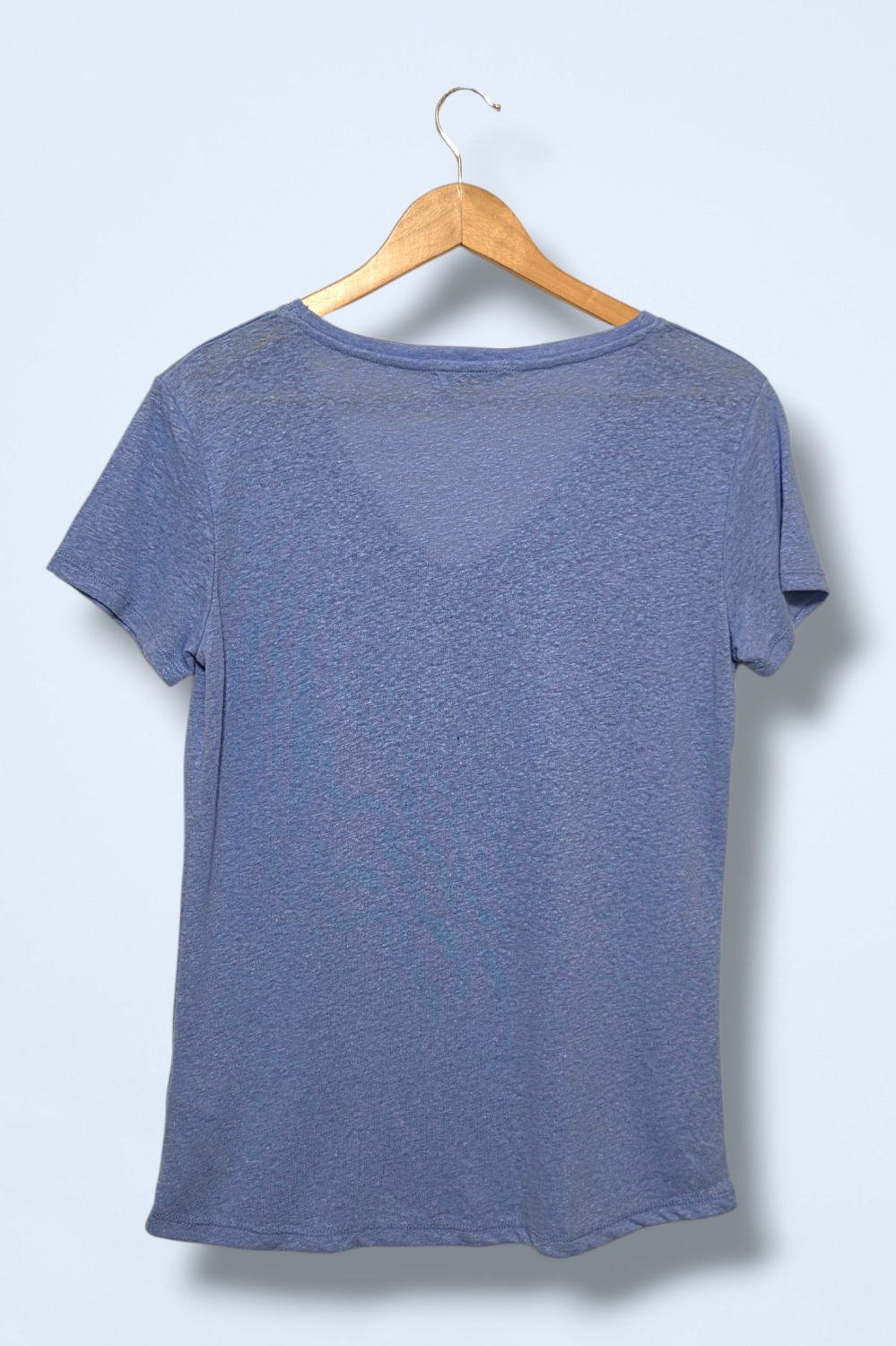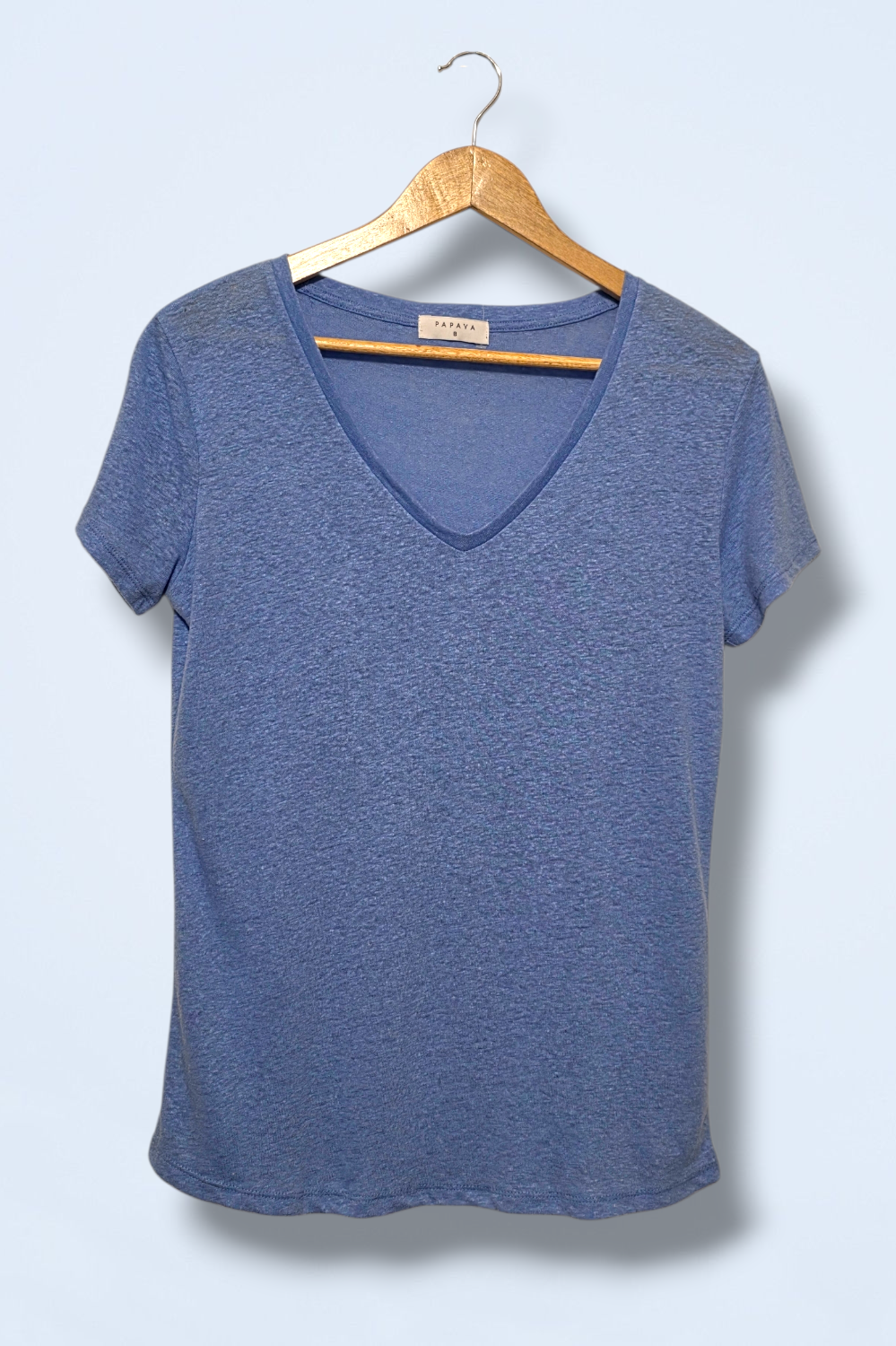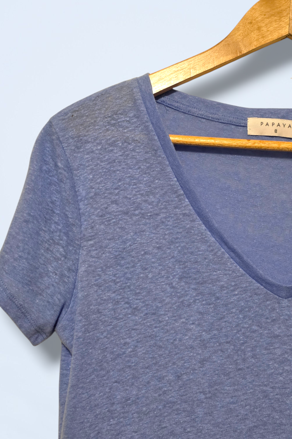 Pale blue v-neck casual t-shirt with short sleeves. Brand: Papaya Size: UK 8 Condition: Excellent, pre-owned condition Material: Linen & polyester... Read more