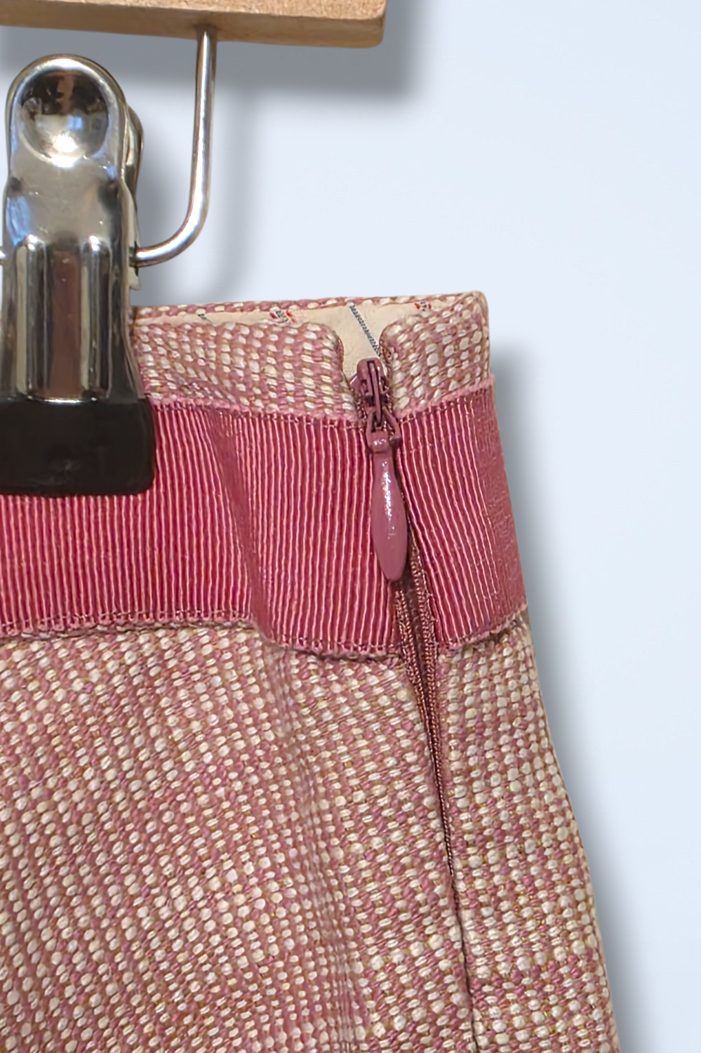 Knee length, lined, heavy weight jacquard skirt. Pink and white with a pink belted design and zipped side. Brand: Jigsaw... Read more