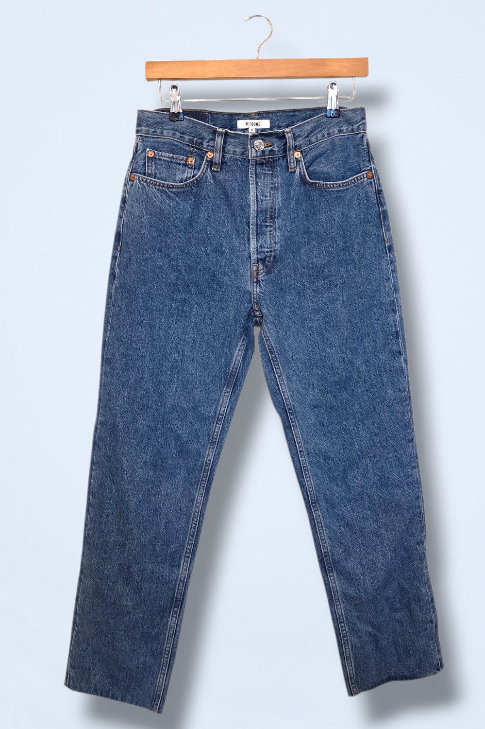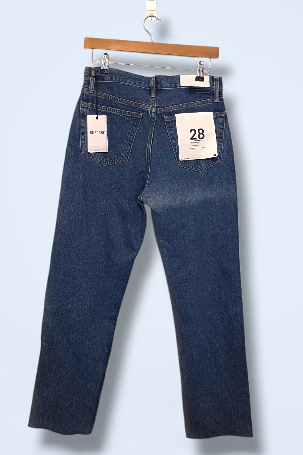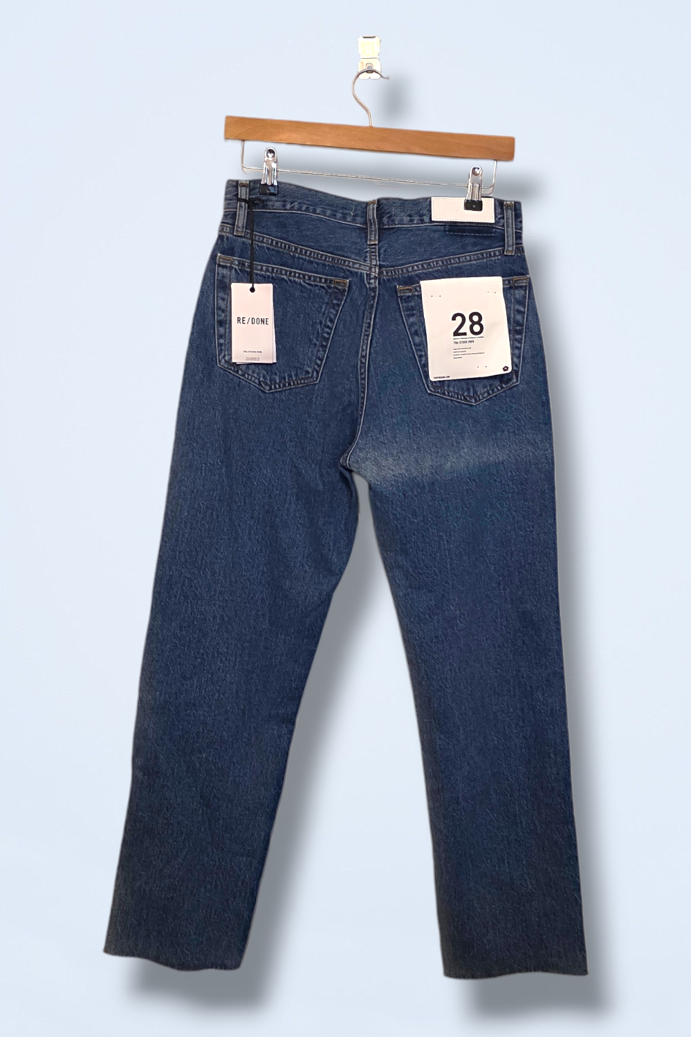 Indigo denim jeans, high rise straight leg. Cropped in-seam and classic 5 pocket design. Brand: Re/done Condition: New, with tags.... Read more