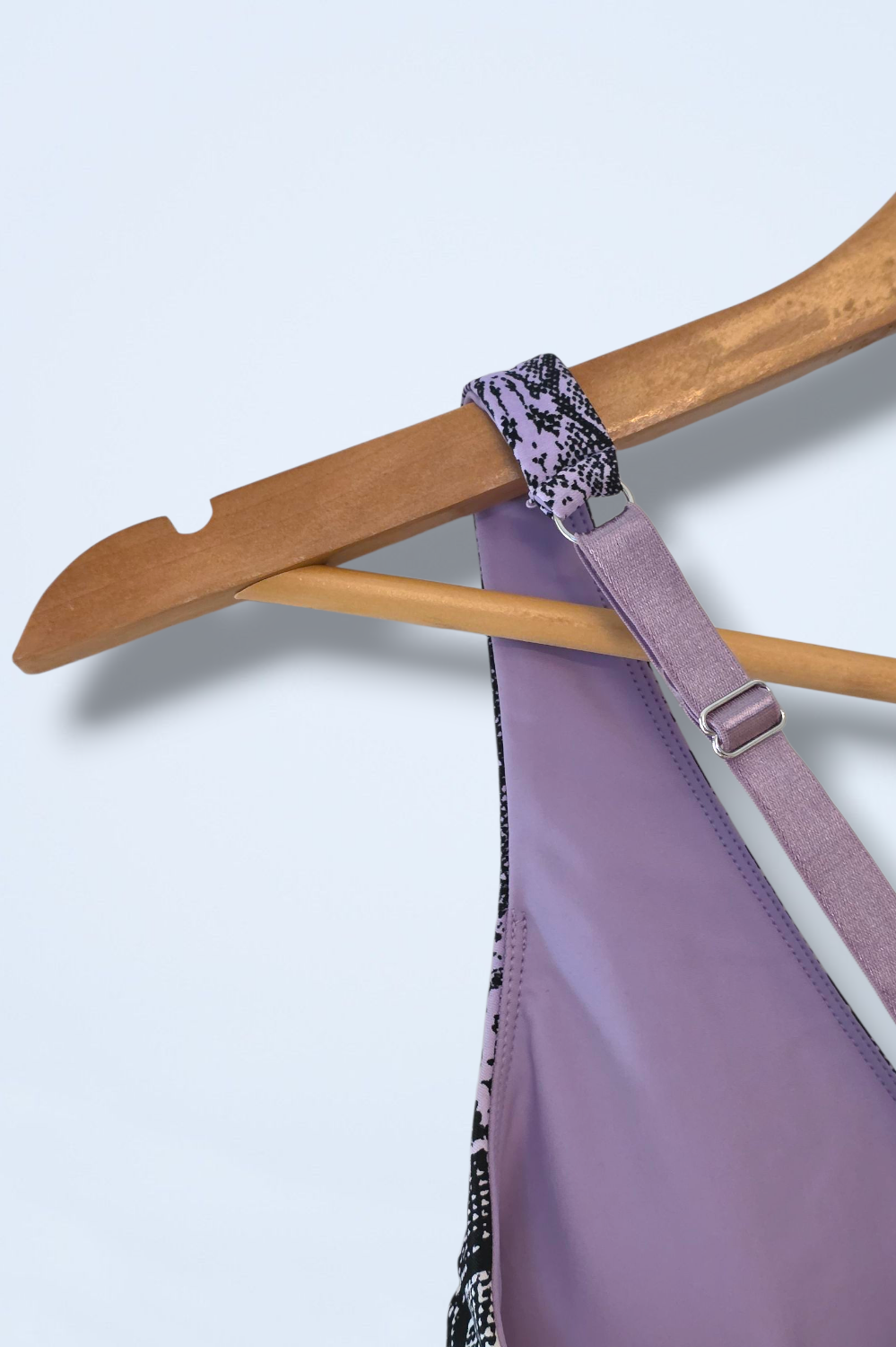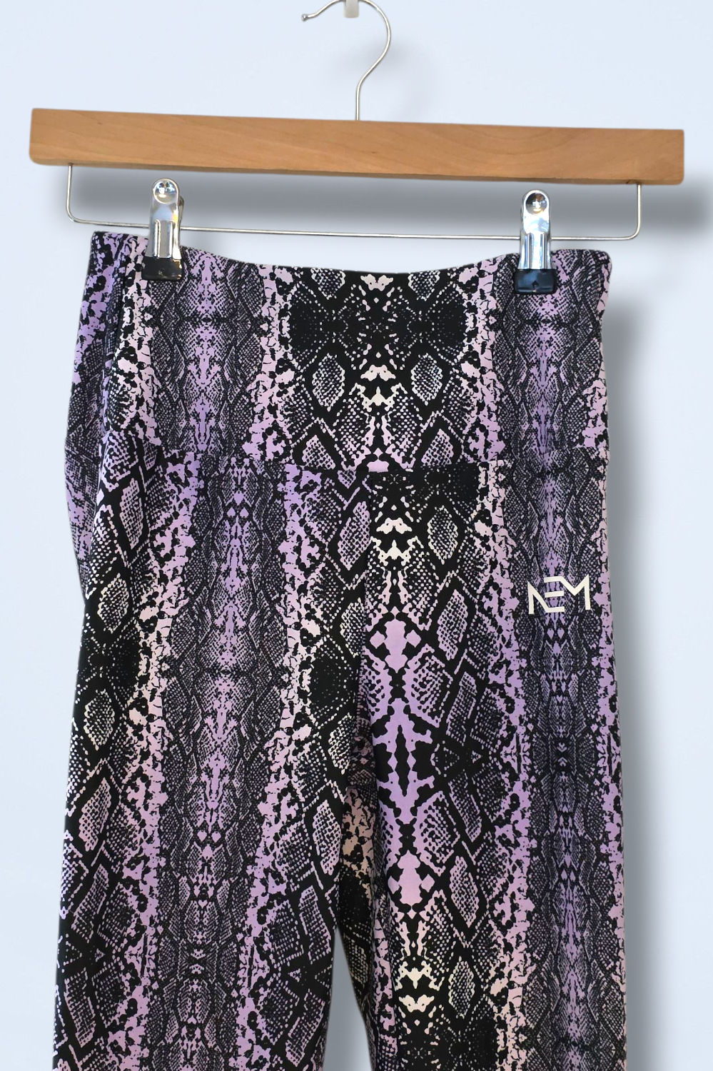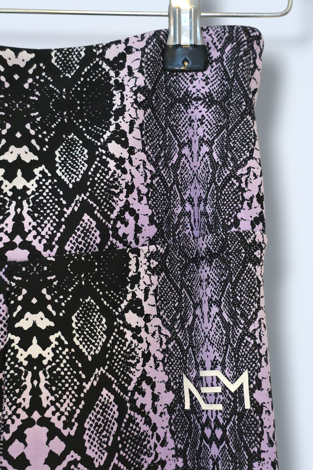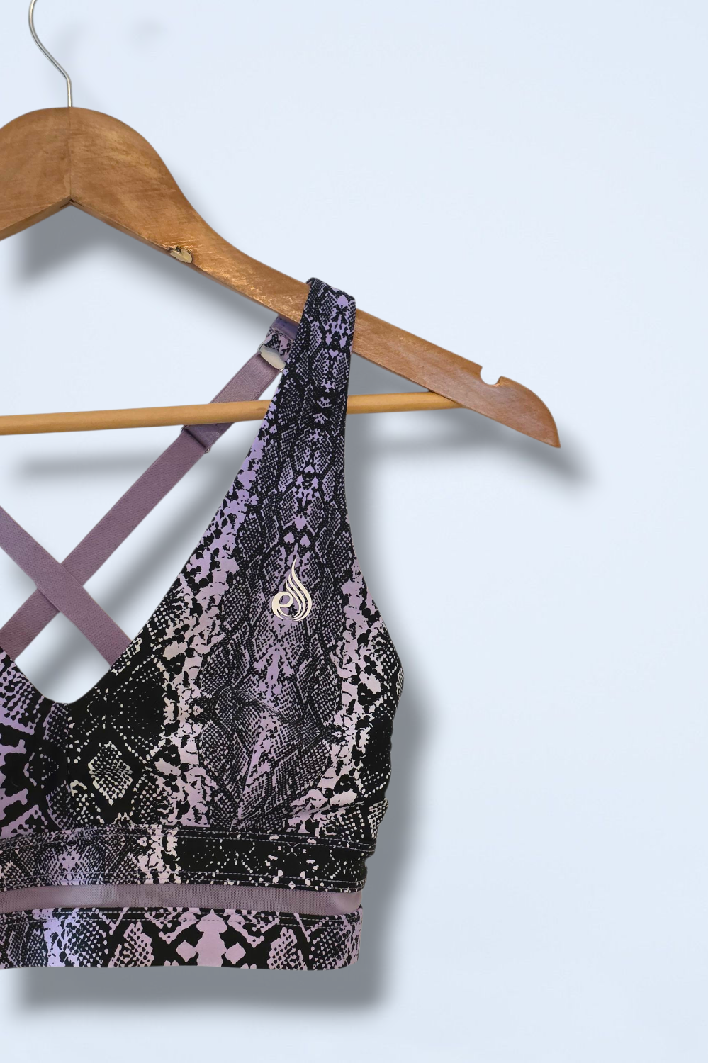 Matching two-piece gym set. Purple & black snake Print, includes top with adjustable straps and hidden support and matching high waist, scrunch bum bottoms.
